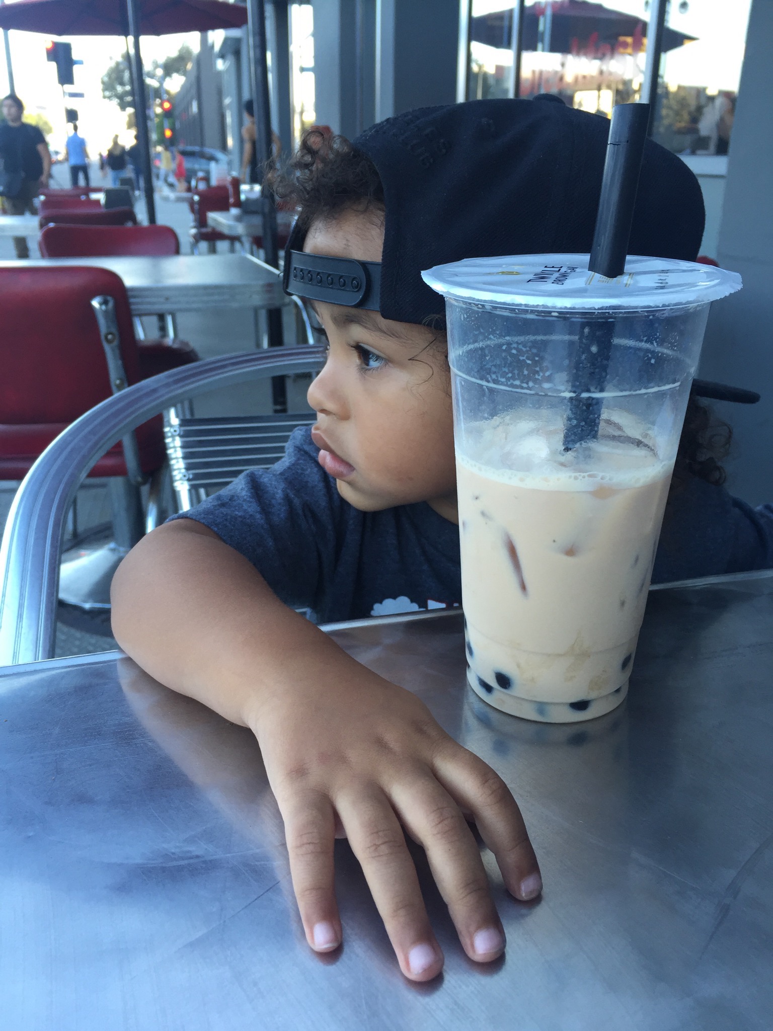 Loves: pizza, French fries, chicken nuggets, chocolate milk, chocolate chip cookies, apple juice, lemonade, and boba drinks. He loves fruit popsicles, and lollipops. He has a very close relationship with our cat, Sushi.